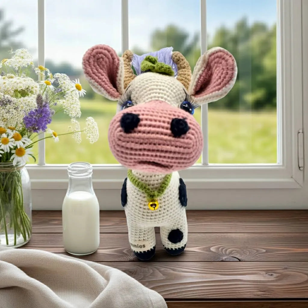 Bring a touch of playful charm to your space with this Large Amigurumi Cow, crafted from 100% cotton. With its adorable design, lifelike plastic eyes, and a cute necklace with a bell pendant, this handmade beauty is a true standout. Perfect for decorating nurseries, adding character to shelves, or as a thoughtful gift for animal lovers. Its soft, durable cotton yarn makes it safe and snuggly for kids and adults alike.